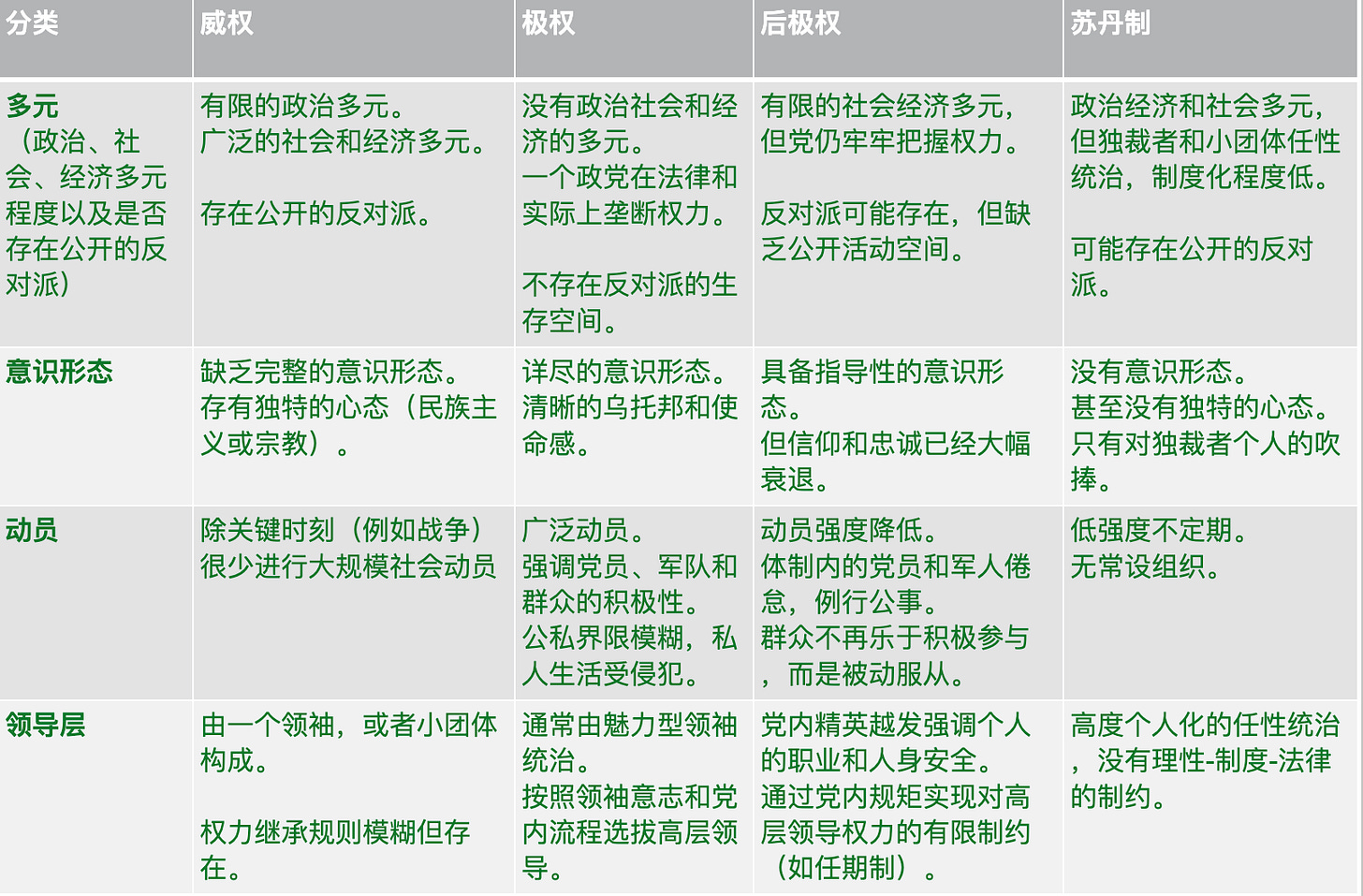 Linz 将专制政权分为四个亚类型:极权、后极权、威权、苏丹制。