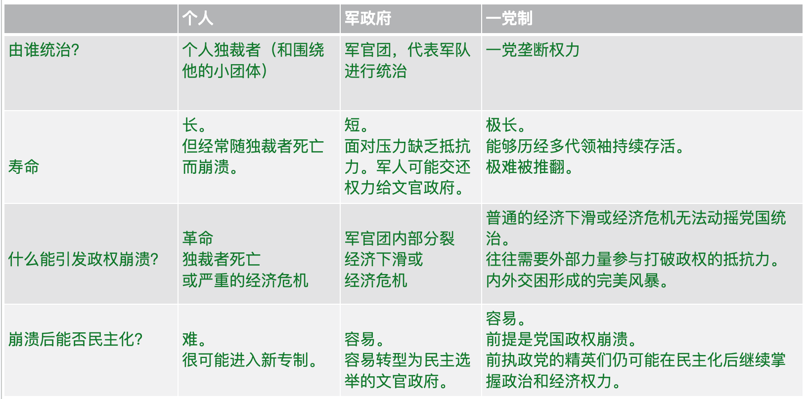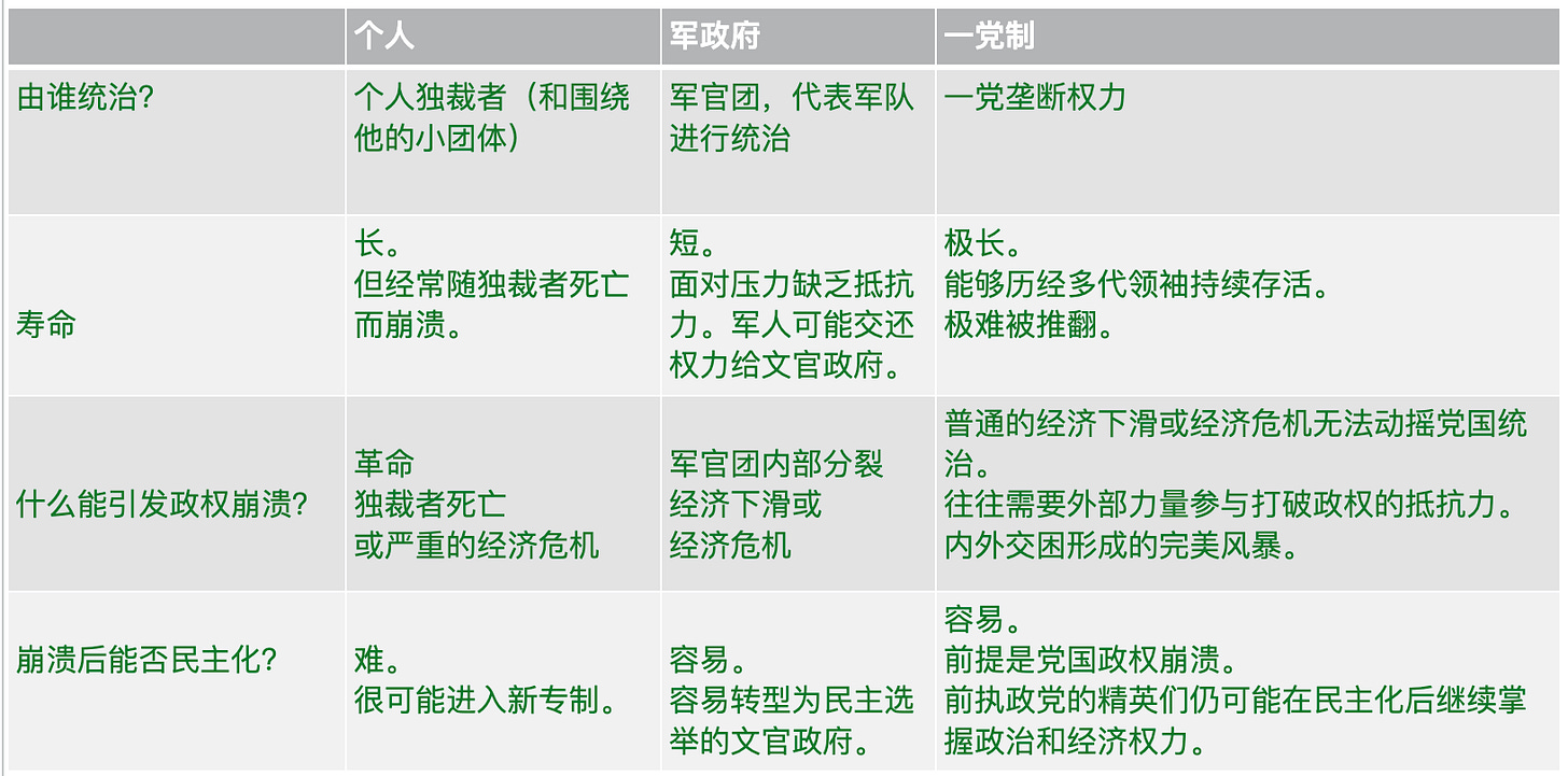 按照谁真正在统治国家将专制政权分为三类:个人、军政府、一党制。Geddes 更强之处在于,她按照这单一简洁的指标对不同专制政权的寿命、稳固程度和民主化建立了一整套可检验的假说。